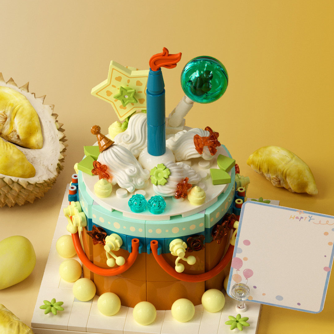 砰!禮花漫天飛揚,祝你天天開心; 榴蓮與芒果香甜濃郁,與味蕾一同暢游快樂