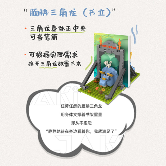 任勞任怨的靦腆三角龍, 用身體支撐著書架重量, 卻從不抱怨, “靜靜地待在旁邊看著你,我就滿足了"